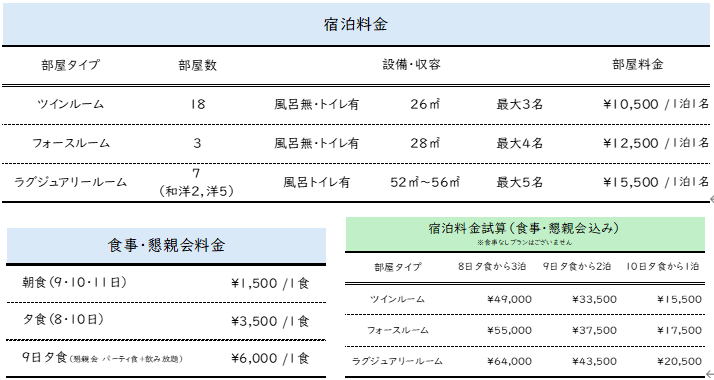 ※残部屋数について随時大会HPにて案内するよう努めますが,お申し込みのタイミングと空き部屋の状況によって,ご希望の部屋タイプを予約できない場合がございます。
