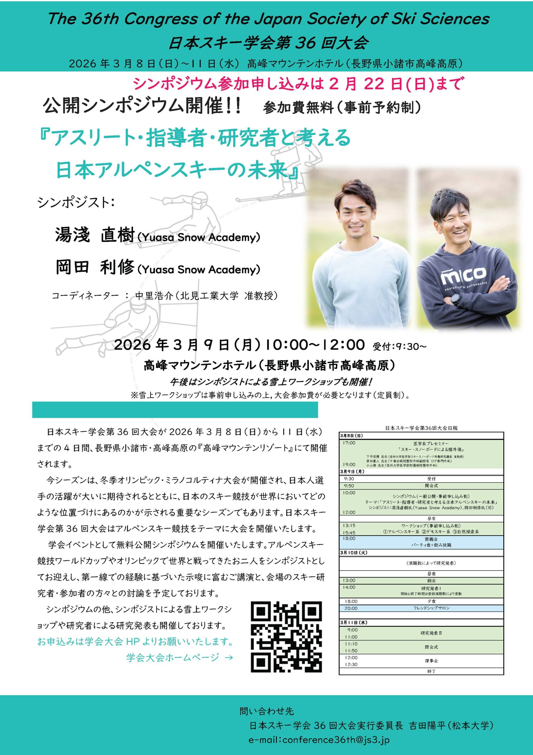 アルペンスキー競技ワールドカップやオリンピックで世界と戦ってきたお二人をお迎えし、第一線での経験に基づいた示唆に富むご講演と、会場のスキー研究者・参加者の方々との討論会を予定しております。